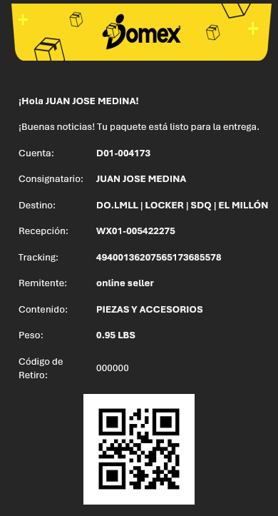 - Una vez tu paquete este en el locker recibirás un correo de notificación con un código QR para retiro.